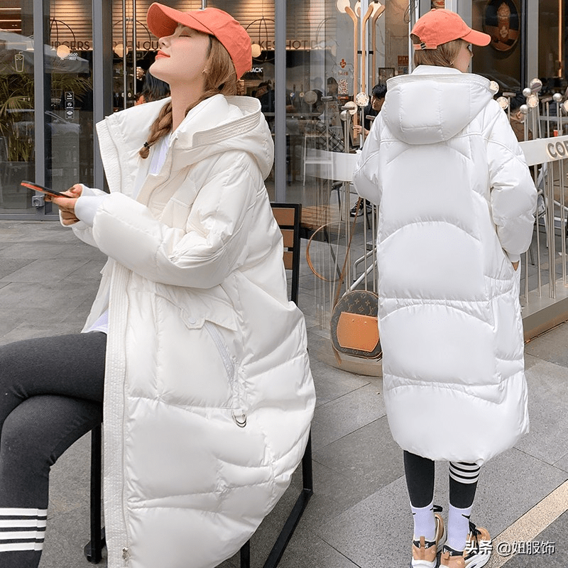 白鴨絨休閒學院風過膝長款連帽麵包保暖羽絨服